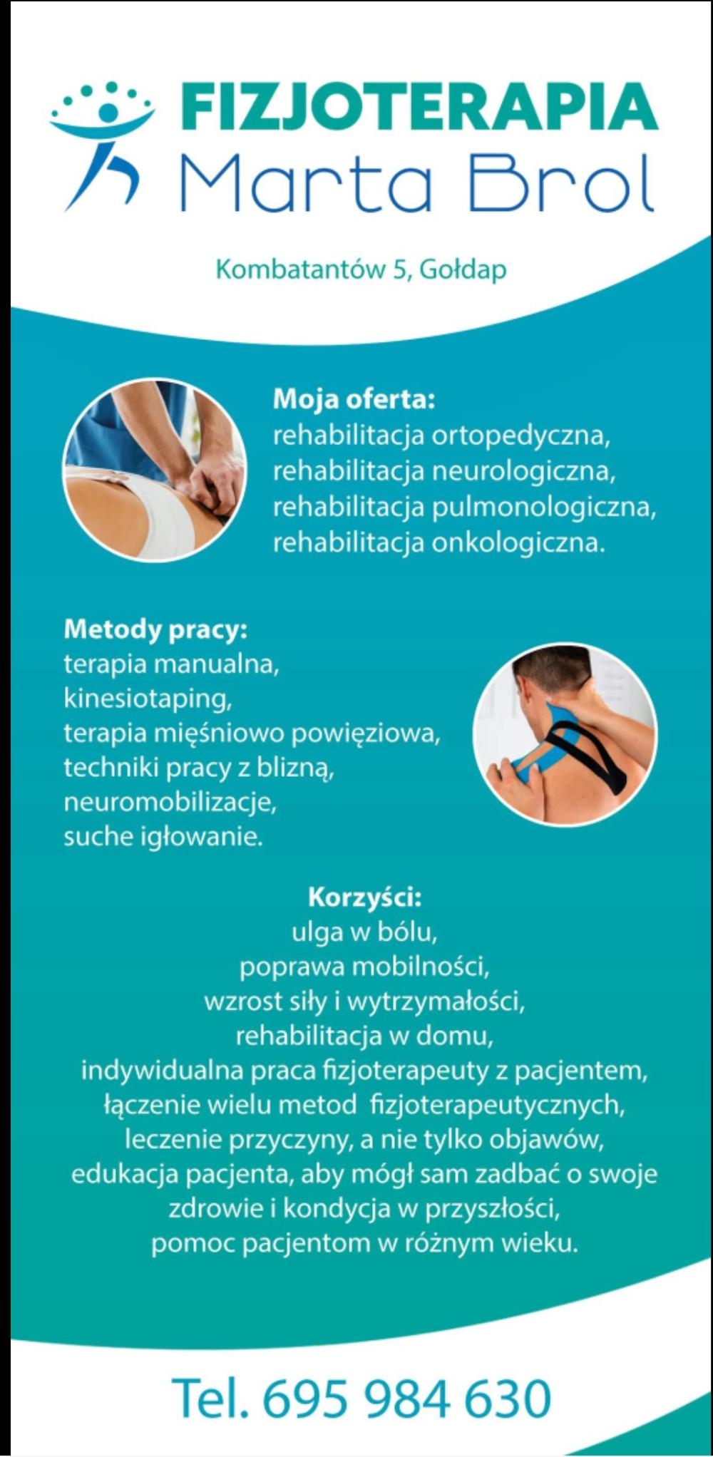 Zmagasz się z bólem kręgosłupa, stawów czy mięśni? A może potrzebujesz rehabilitacji po urazie lub operacji? Fizjoterapia Marta Brol to kolejna firma, którą prezentujemy w ramach akcji „Fajni lokalni”. Działalność powstała w 2025 r. dzięki wsparciu naszego urzędu w postaci jednorazowych środków na podjęcie działalności gospodarczej, której siedziba mieści się w Gołdapi przy ulicy Kombatantów 5.